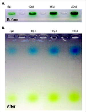 The table below contain the components of a 6x loading buffer used in the lab. It has two colors one bluish that migrates slowly and one yellow that migrates rapidly. This loading buffer should be compatible with PCR (see below). Note that the buffer should contain either Orange G or Tartrazine as the yellow color. Orange G is preferred since it migrates faster.