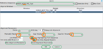 Align the two sequences using the Tools>Align sequences … function. Use the settings marked in Figure 9.