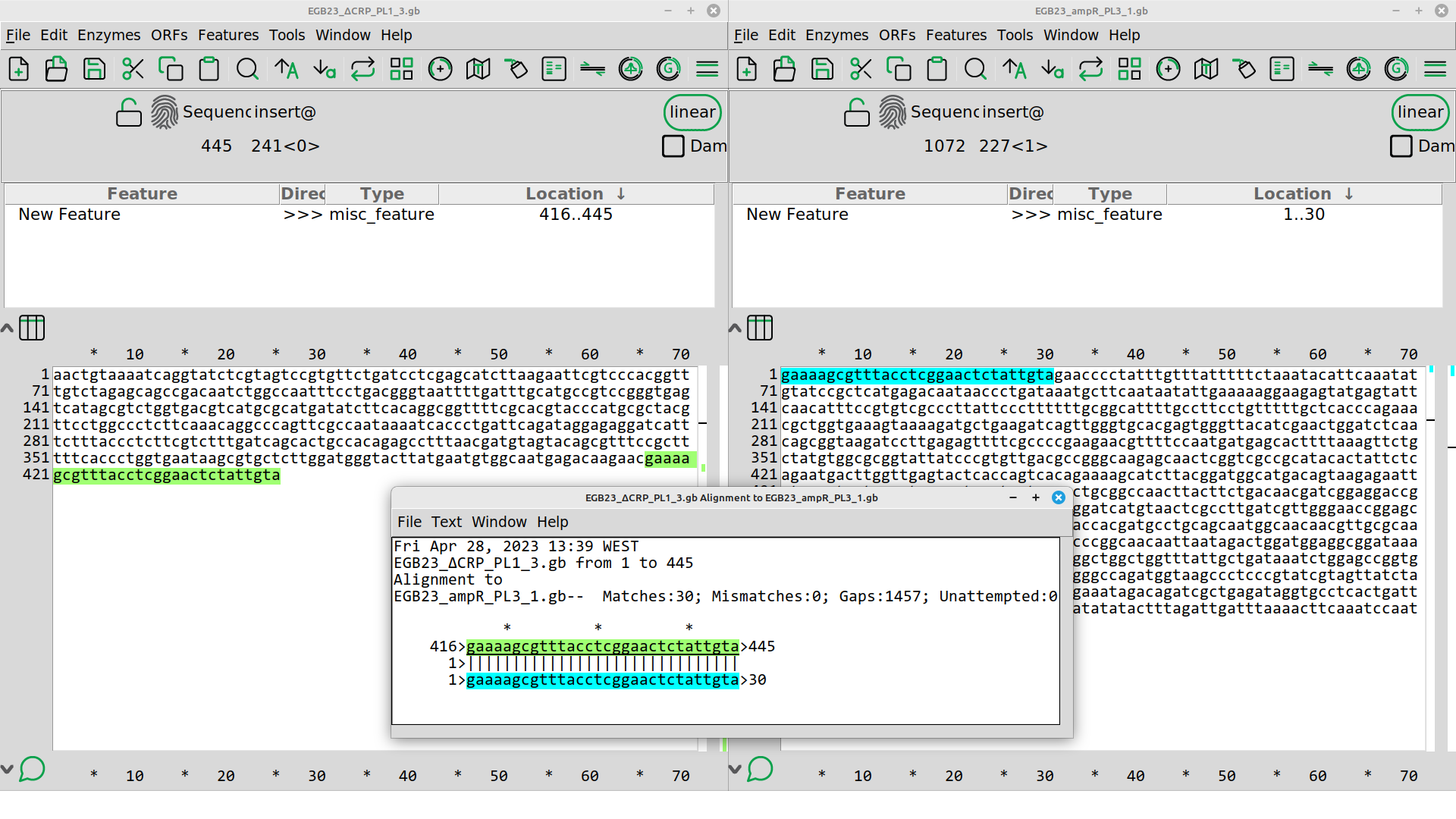 Replicating this process in ApE is very easy. Open two fragments that are next to each other. The order can be deduced from Figure 3.