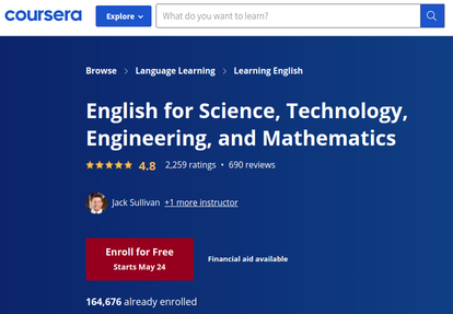 English for Science, Technology, Engineering, and Mathematics, a course created by the University of Pennsylvania, and funded by the U.S. Department of State Bureau of Educational and Cultural Affairs, Office of English Language Programs. This MOOC (Massive Open Online Course) is offered for free.