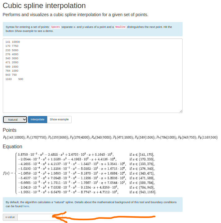 There are several tools available online to perform cubic spline interpolation. One such tool is the cubic spline interpolation tool available here. See a list of alternative tools below. Alternative online cubic spline tools: