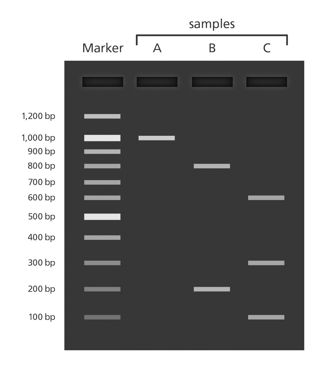 We can determine the length of a DNA fragment using agarose gel electrophoresis by comparison to a set of known molecular weight fragments run on the same gel. The set of known molecular weight fragments is often called a “DNA ladder” or a “Marker” (below).