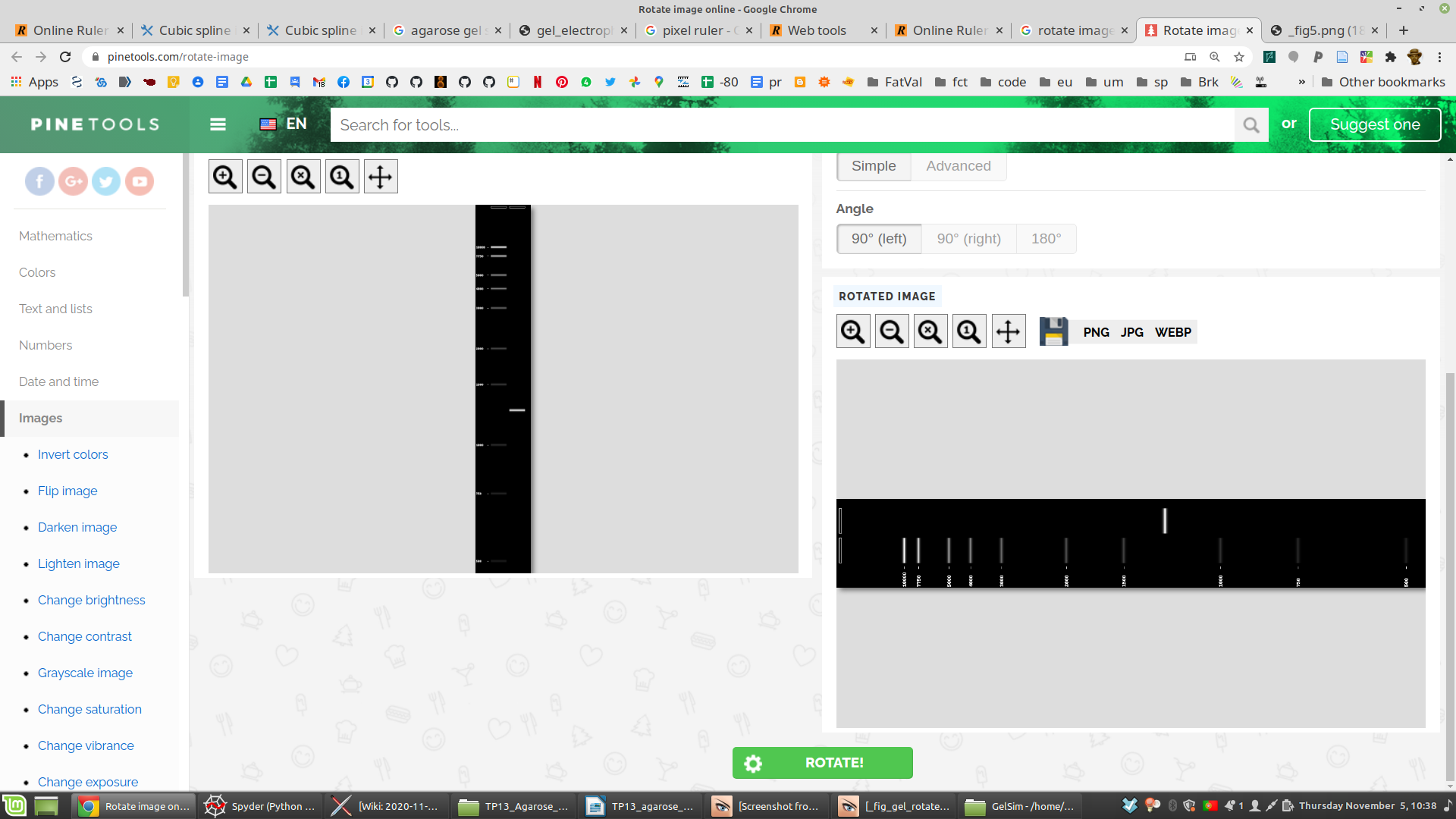 Rotating the image 90 degrees is not strictly necessary, but makes the analysis easier. The PINETOOLS “rotate image” web tool (below) can be found here. Copy and paste the gel image into the tool. Then select rotate 90 degrees left and click “Rotate!“.