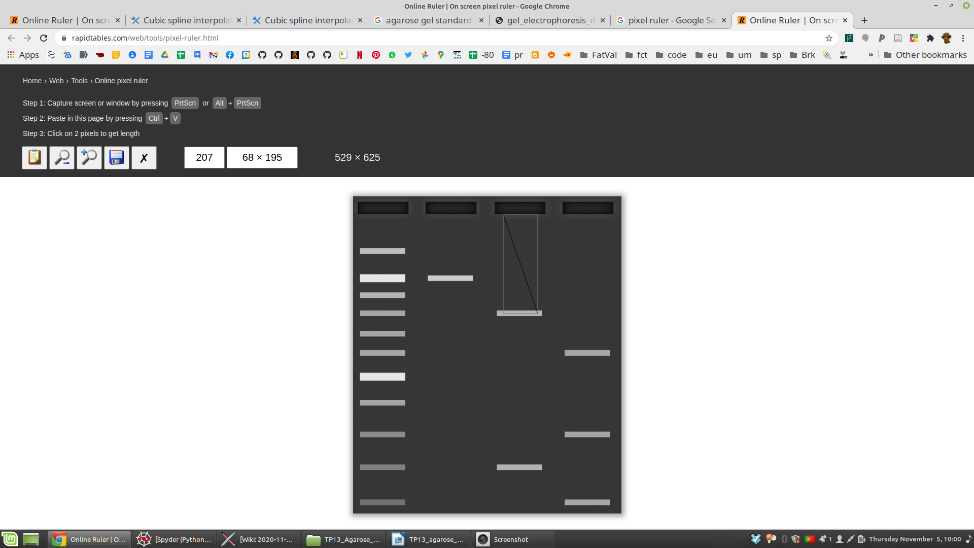 Pixel ruler should work on any computer that has a web browser. This tool is very easy to use. Just copy and paste a gel image on the screen and you can start measuring. This tool allows you to form boxes (see blue arrow in Fig 16) and the size of the box in pixels is shown (see blue box in Fig 16). This tool is available here.