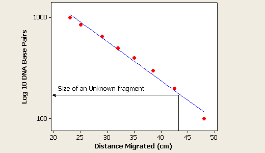 The migration rate depends on the size of the molecule and can be approximated by plotting the migration distance on the x-axis against the logarithm of the length of the DNA molecules on the y-axis below.