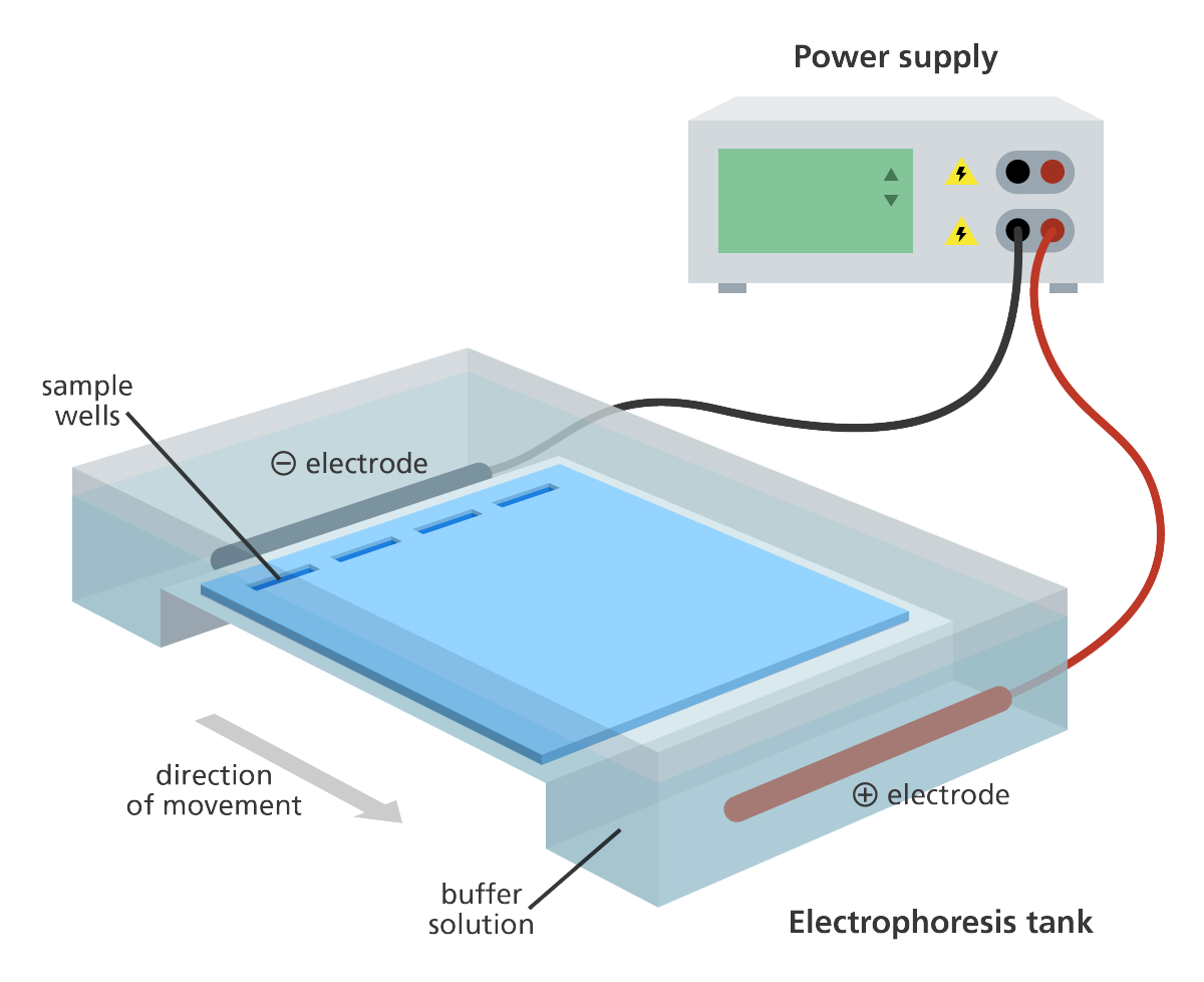 A common method to study DNA in the laboratory is by agarose gel electrophoresis. A slab of agarose is placed in a buffer between two electrodes and an electrical field is applied (Fig 1). DNA will migrate through the agarose at a rate that depends on the size of the molecule, where shorter molecules migrate faster than longer ones.