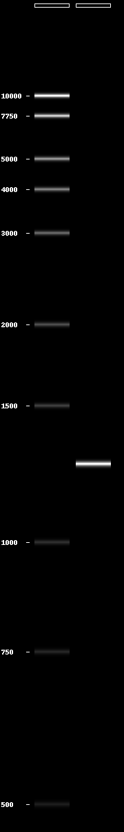 We will use the Marker (left lane above) to calculate the length of the DNA fragment in the right lane in the figure. The fragment sizes are 500, 750, 1000, 1500, 2000, 3000, 4000, 5000, 7750 and 10000 bp as indicated.