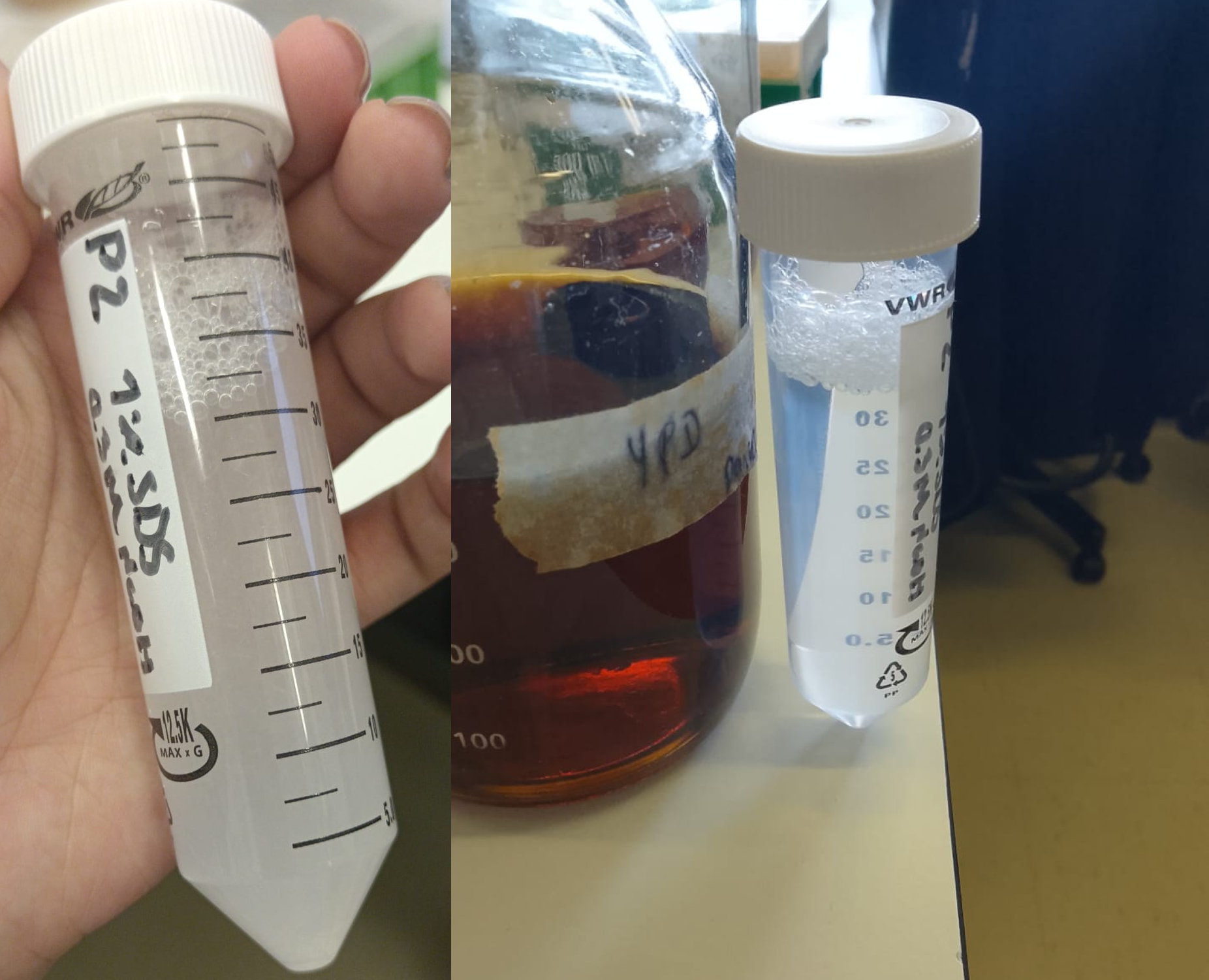 - Add 200 µL of buffer P2, mix by inversion about ten times, do not vortex or else the chromosomal DNA might fragment and contaminate the plasmid DNA. Wear goggles for this step! Sometimes the SDS in the P2 buffer precipitates (see image below). This can usually be resolved by heating water in the electric kettle an immerse the tube for 1-2 min. Be careful to release pressure slowly when opening the tube.