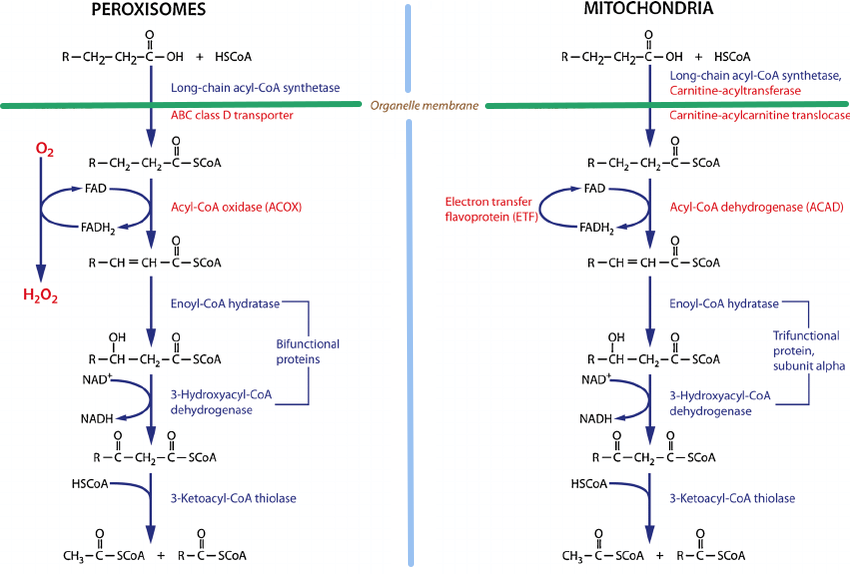Unlike in mitochondria, where FADH₂ would enter the electron transport chain, peroxisomal FADH₂ directly donates its electrons to molecular oxygen, leading to the formation of hydrogen peroxide (H₂O₂) instead (Figure 2). This step is unique to peroxisomal β-oxidation since, in mitochondria, electron carriers like FADH₂ contribute to ATP synthesis through oxidative phosphorylation. In peroxisomes, however, FADH₂ is quickly oxidized back to FAD, enabling continuous fatty acid oxidation but producing H₂O₂ as a byproduct instead of ATP.