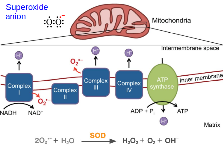 Complex I and III can inadvertently leak electrons to molecular oxygen (Figure 3), forming superoxide. The superoxide anion (O₂⁻•) generated in Complex I and III of the mitochondrial electron transport chain is detoxified primarily by the enzyme superoxide dismutase (SOD).