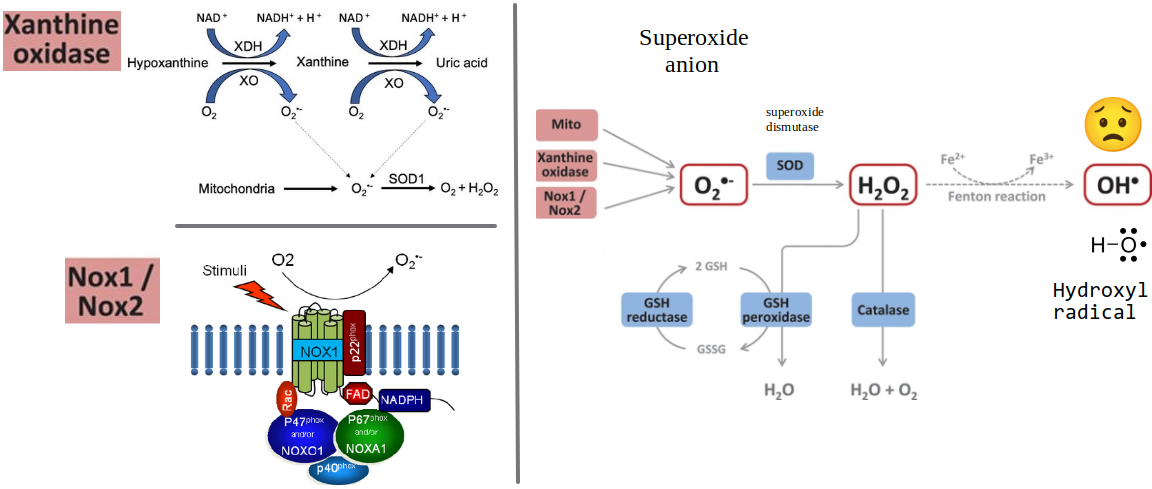 - Function: NOX1 generates superoxide (O₂⁻•), which can be converted into other ROS, such as hydrogen peroxide (H₂O₂).