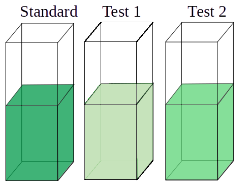 The Standard reaction in Figure 9 contains only hydrogen peroxide and and cobalt(II) carbonate. All of the available peroxide should oxidize cobalt(II) to cobalt(III). The Test reactions contain H2O2 and cells. Some of the peroxide should have been consumed by the catalase in the cells, so the absorbance value at 440 nm should be lower than for the Standard reaction. The absorbance that we should have observed for the consumed H₂O₂ is the absorbance for the Standard reaction minus the absorbance of the Test reaction. We would expect a higher absorbance for the Test 2 reaction, since less cells should have consumed less peroxide.