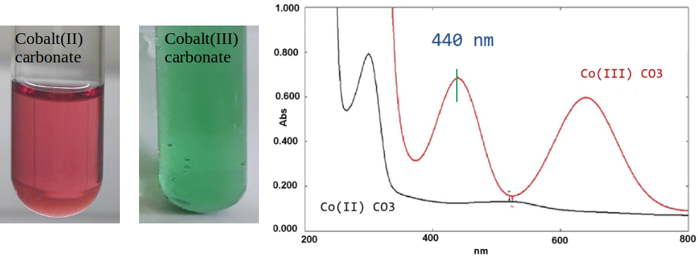The remaining peroxide is measured by allowing the hydrogen peroxide to oxidize cobalt(II) to cobalt(III) which can be measured with a spectrophotometer at 440 nm (Figure 8). The oxidation is performed in the presence of carbonate ions which causes a pink complex with cobalt(II) and a green complex with cobalt(III).
