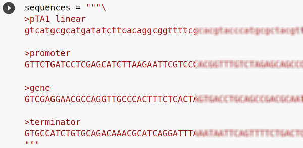 The assembly can also be done using pydna directly. For this exercise, we will use pydna and google colab which you can use if you have a free google account. Colab is a hosted Jupyter Notebook service that requires no setup. A Jupyter notebook is a python program file that can also show comments and images as well as intermediate results. Colab allows you to write and execute Python in your browser without installing any software.