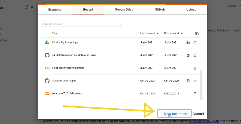 Go to Google colab in you web browser. Create a new notebook by clicking on the “New notebook button”, see the image below:
