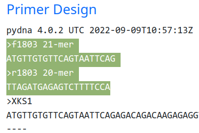 Go to Pydnaweb and click in the “Primer designer” button. Replace the default sequence with your sequence, be sure to use use proper FASTA or GenBank format. In this example, the gene for S. cerevisiae xylulokinase XKS1/YGR194C is used as an example below.
